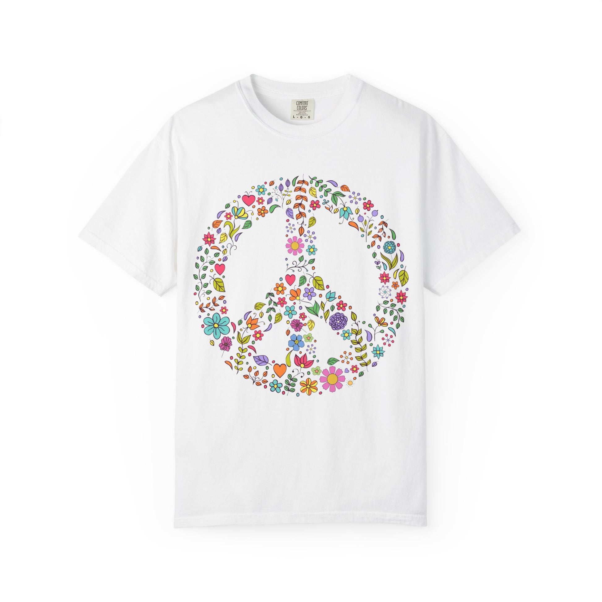 Bring good vibes wherever you go with this Comfort Colors short sleeve T-shirt featuring a bold, oversized peace sign made entirely of colorful flower and heart doodles. It’s the perfect mix of vintage hippie energy and playful coastal style, designed for anyone who loves sunshine, freedom, and laid-back living.